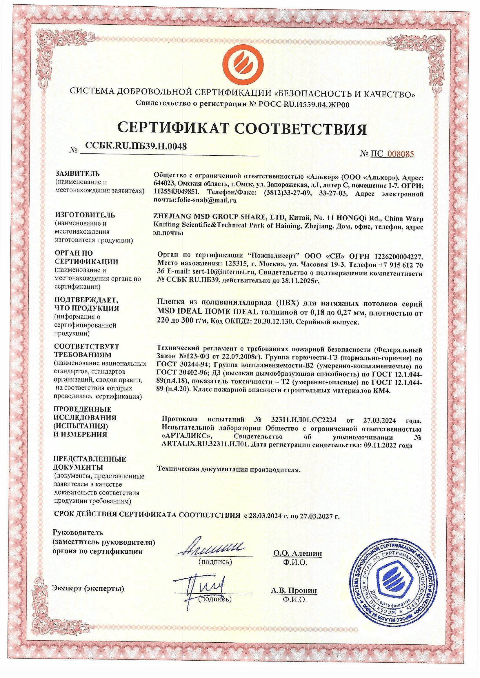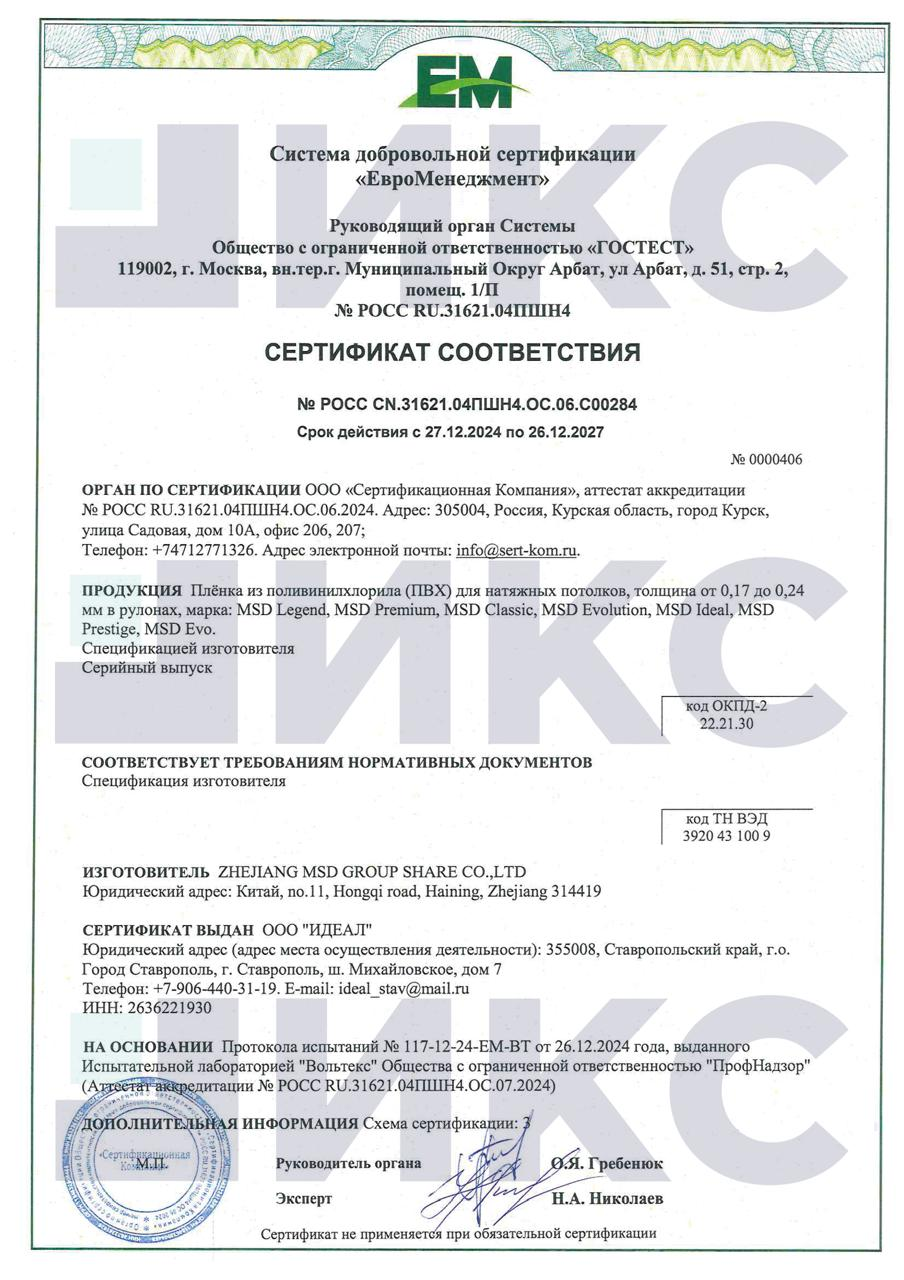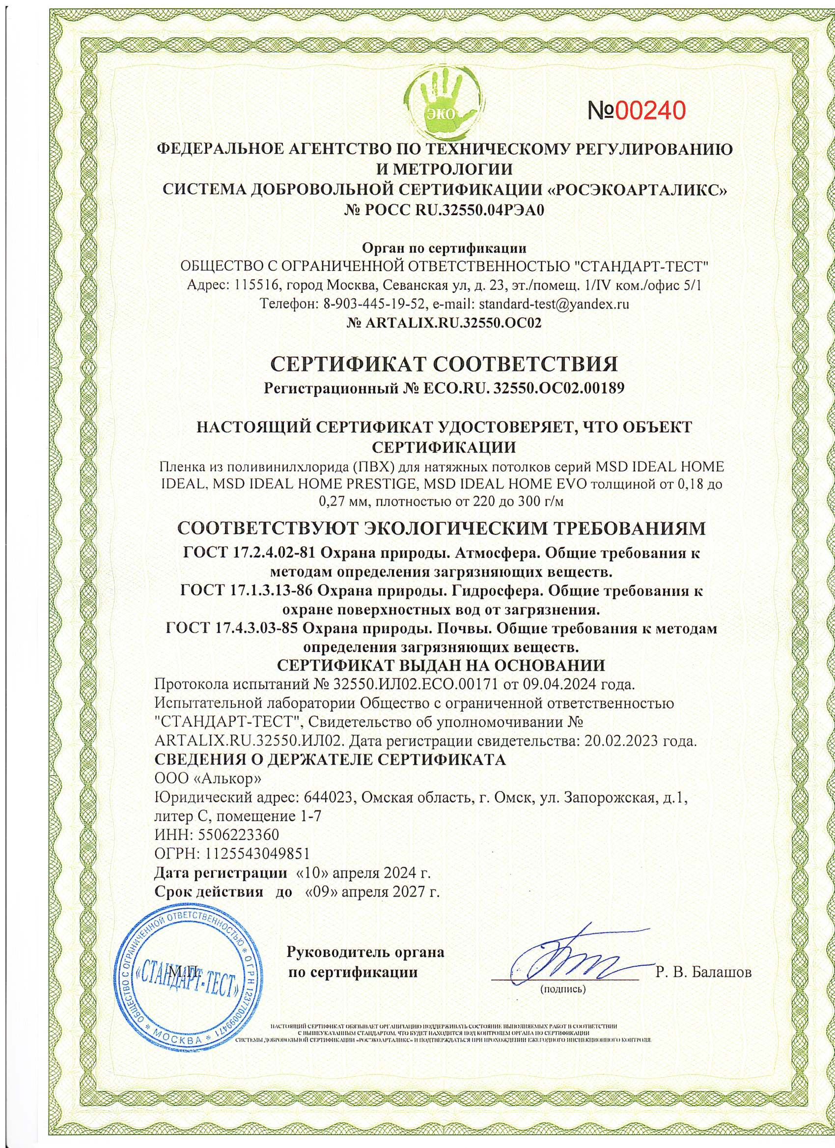 ЭКОЛОГИЧЕСКАЯ СЕРТИФИКАЦИЯ Плёнка для натяжных потолков MSD прошла добровольную экологическую сертификацию в России. Потолки из плёнки MSD соответствуют экологическим нормам, поэтому их уже давно называют ЭКопотолки.