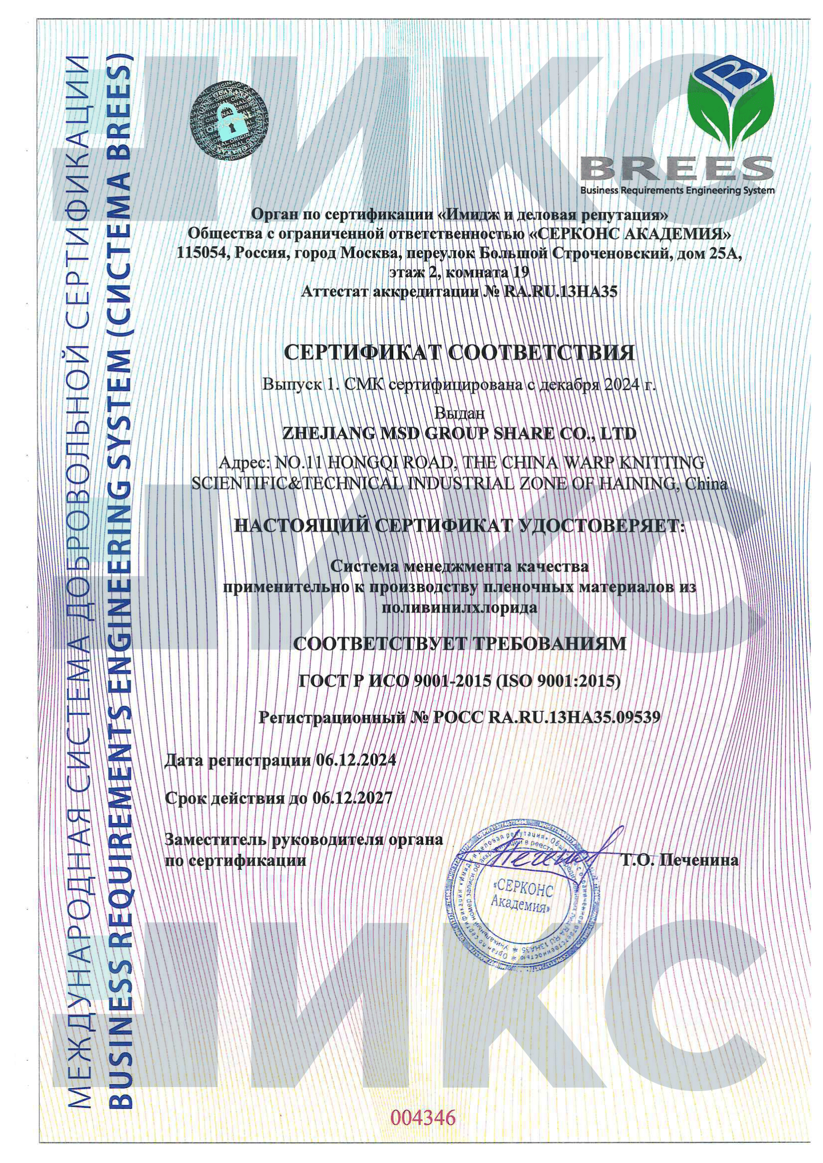 ПОДТВЕРЖДЕННОЕ КАЧЕСТВО Качество плёнки MSD подтверждено сертификатами соответствия. Поставщик плёнки MSD компания "Фолие ПВХ" провела все необходимые испытания для сертификации на соответствие продукции требованиям международных систем менеджмента качества.